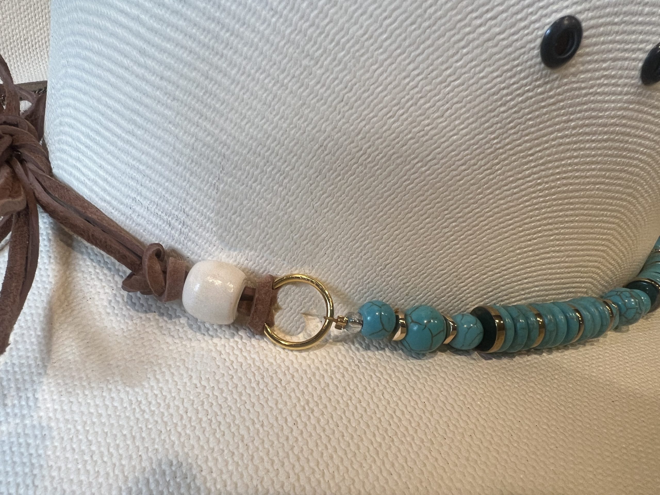 This classy cowboy hat band is accented with gold color metal beads to compliment the turquoise beads. There is an attached accent piece, and leather ties make it adjustable. It’s perfect to dress up your boots or give as a gift.