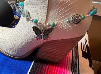 This elegant Western boot bracelet is accented with turquoise beads and silver concho-style details for a classic Southwestern touch. The butterfly charm centerpiece adds a graceful, feminine accent, making it perfect to dress up your boots or give as a thoughtful gift.