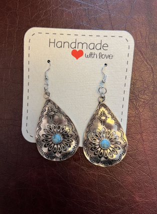 These classy teardrop earrings feature intricate Western-style engravings accented with a turquoise stone center. The antique silver finish gives them a timeless Southwestern look, perfect to pair with your favorite denim, boots, or dress them up for a night out.